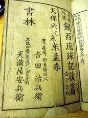 | 20:17, 21 February 2016 | Nantoshi-okinawa.JPG (file) | 347 KB | LordAmeth | Okinawa Island as it appears in the 琉球各島図 section of Arai Hakuseki's Nantôshi. Sakamaki-Hawley Collection, University of Hawaii. Photo by User:LordAmeth, 6 Sept 2011. | |